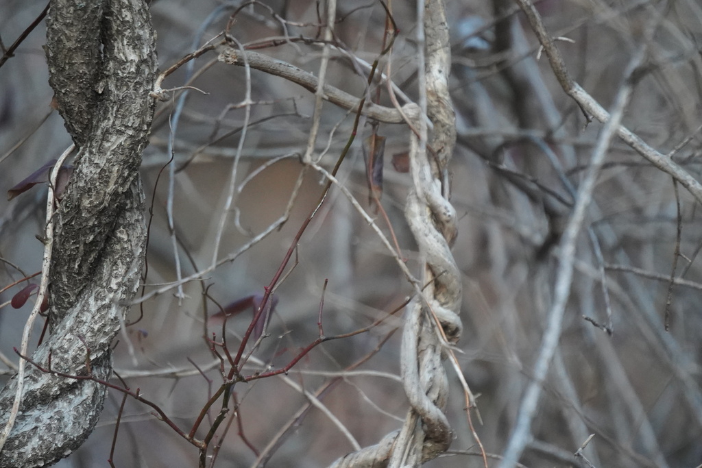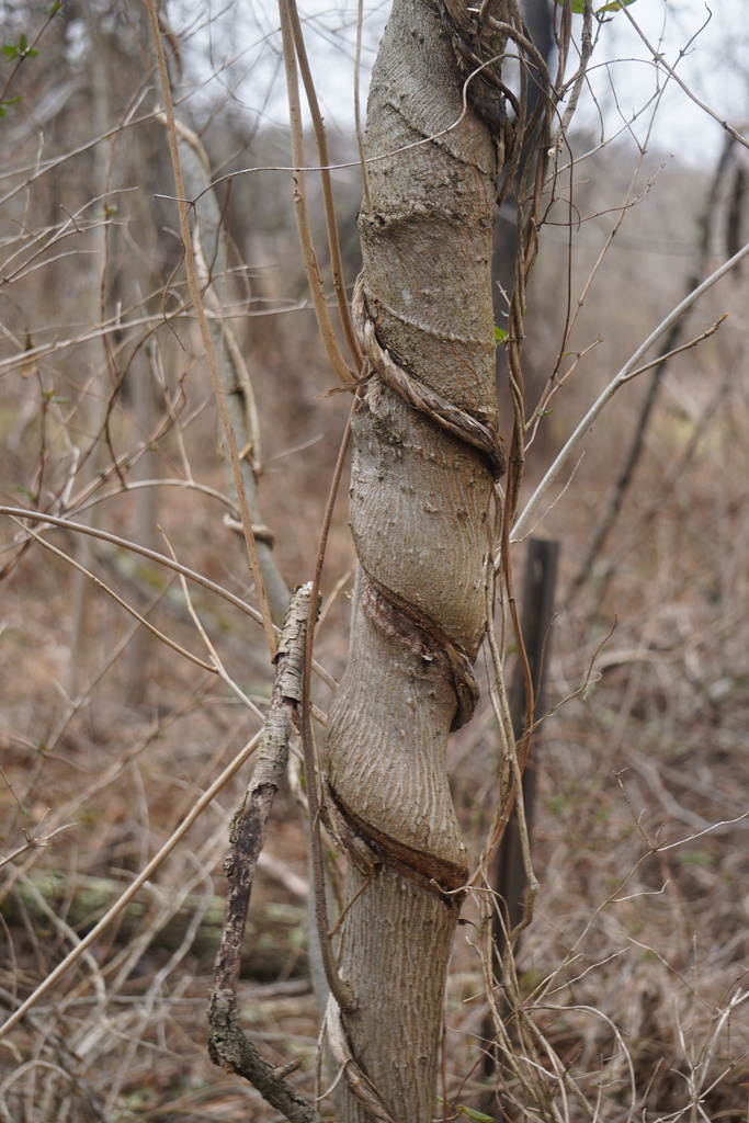 Vines that twine up trees include honeysuckle, bittersweet, and wisterias. Only Japanese honeysuckle and Japanese wisteria twine up and to the left. Of these three types of vine, only honeysuckle has shredding bark. Grape climbs by tendrils but this is not obvious in older vines. It has shredding bark as well, but it is much darker and will not be as twisted around a tree as honeysuckle will.