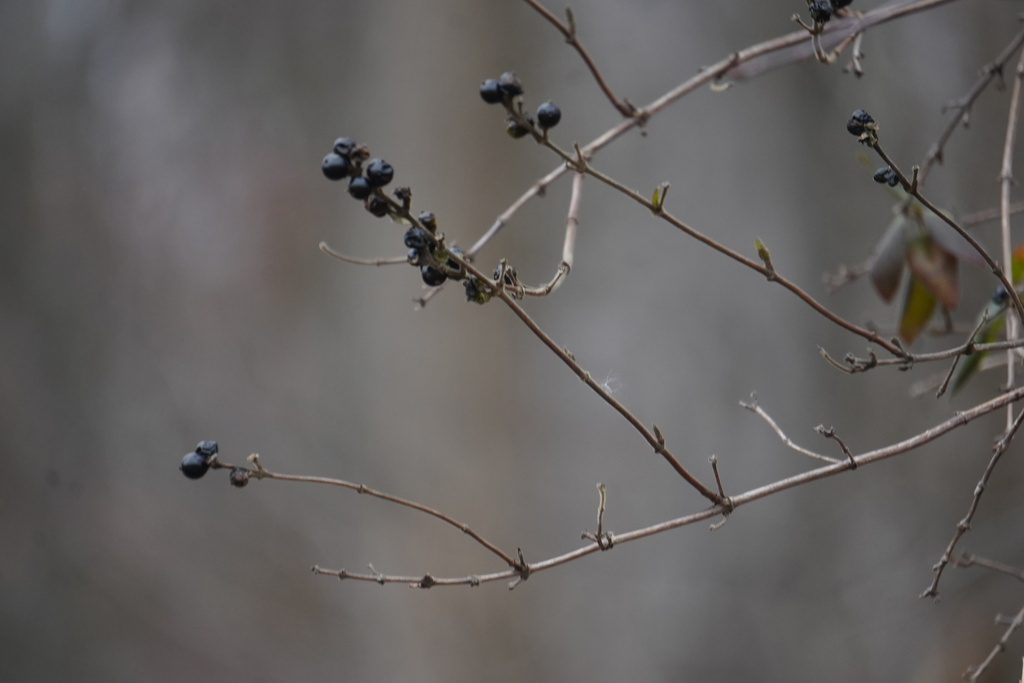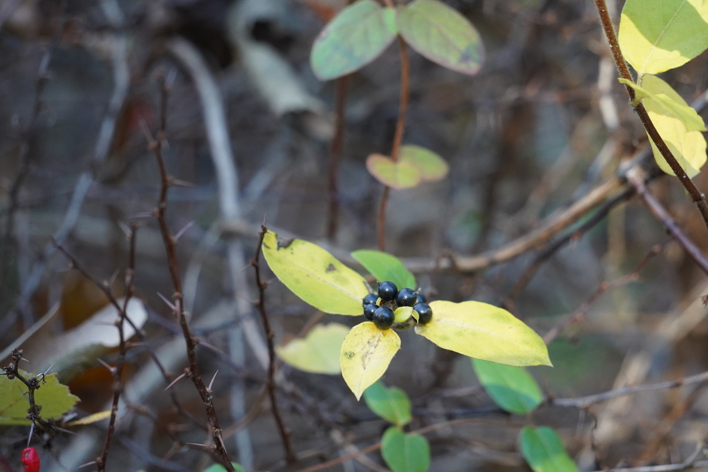 | Japanse Honeysuckle, Lonicera japonica, berries and leaves in winter |