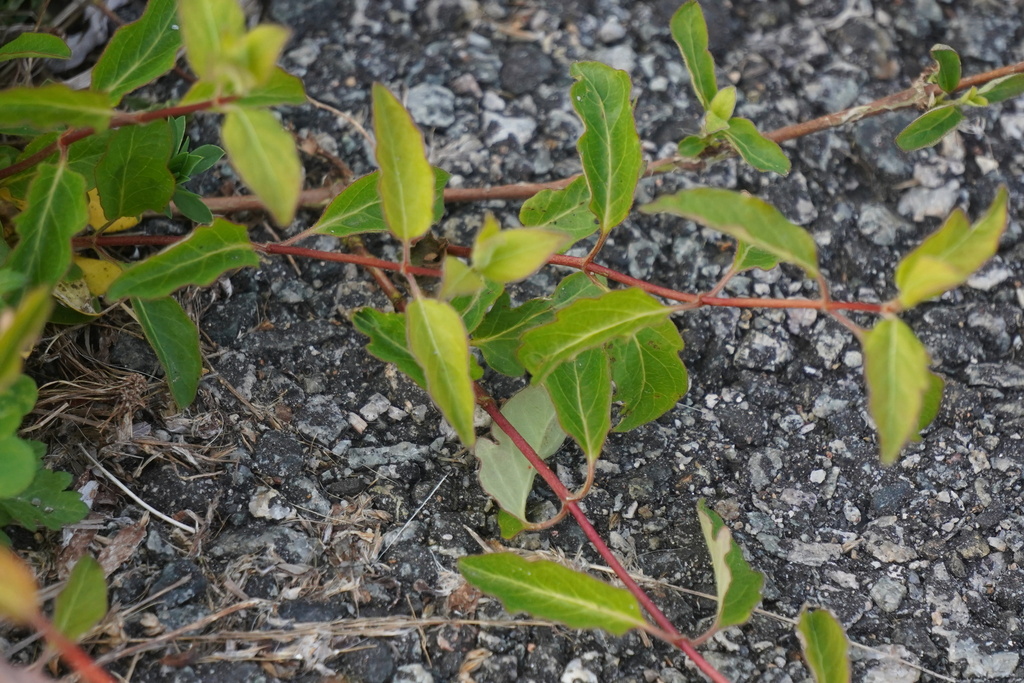 It can be difficult to separate Japanese honeysuckle from bush honeysuckle if you can't see the whole plant. Japanese honeysuckle stems are downy. The leaves are widest at the base and have a point. they are not as large or as long-pointed at Amur honeysuckle leaves and are thinner and longer than Morrow/Tatarian/Bell's honeysuckle leaves.